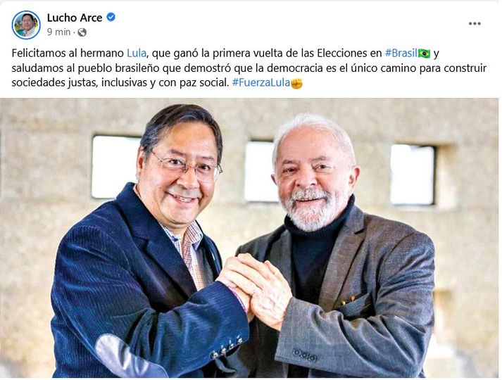 #EleccionesBrasil: El presidente Arce felicita a Lula