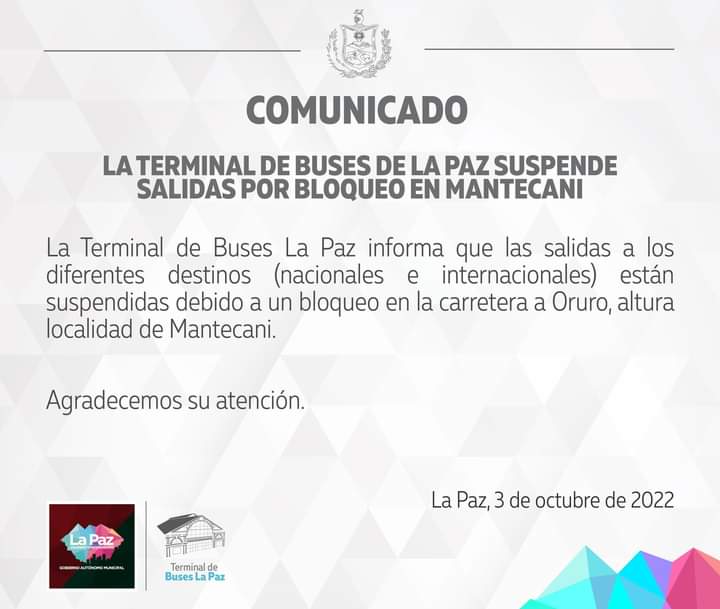🔵 #ANF | La administración de la Terminal de Buses de #LaPaz comunica que se suspenden las salidas debido a un bloqueo en la carretera hacia #Oruro, a la altura de la localidad de Mantecani. https://t.co/e1hoqvecCS