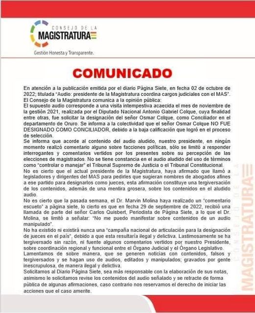 Marvin Molina debe ser detenido inmediatamente. Al presidente del Con. Magistratura lo pillaron. En el comunicado «admiten audio» e intención.