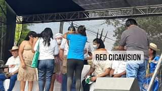 Mujeres indígenas de la nación » Yuki» durante el acto por el 40 aniversario de la cidob, vistieron al Pdte Arce con la vestimenta originaria de los Yuki que es confeccionada con corteza de ambaibo.