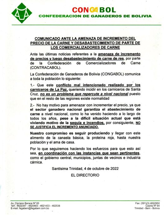 La Confederación de Ganaderos de Bolivia (CONGABOL) garantiza el abastecimiento de carne de res a nivel nacional y rechaza el incremento en el precio del producto al consumidor final.