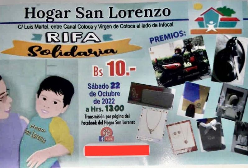 El Hogar San Lorenzo está organizando una #RifaSolidaria este 22 de octubre donde te podrás llevar muchos premios a tan solo Bs 10.