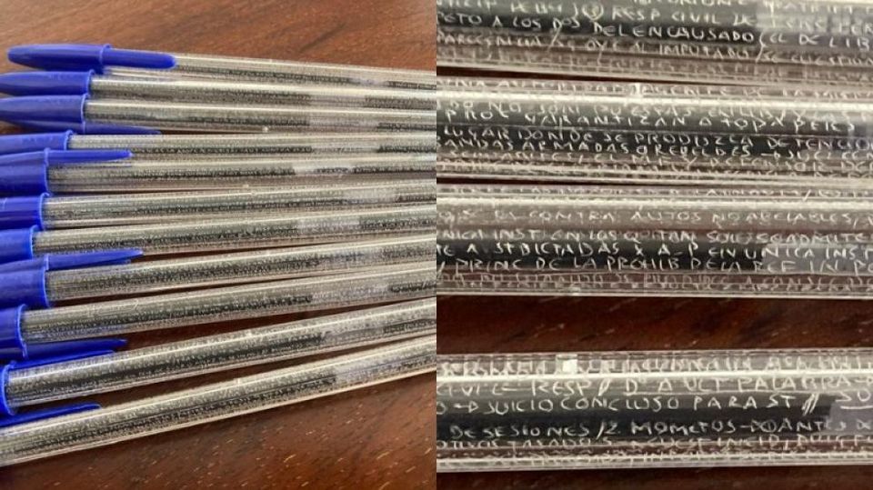 En las imágenes se puede apreciar el temario de la asignatura grabado en todo el tubo transparente del cual se componen los bolígrafos de la marca Bic. «Haciendo orden en mi despacho he encontrado esta reliquia universitaria que confiscamos a un alumno hace unos años: el derecho procesal penal en bolis bic. Que arte! #laschuletasnosoncomoantes», publicó en su cuenta de Twitter la profesora.
