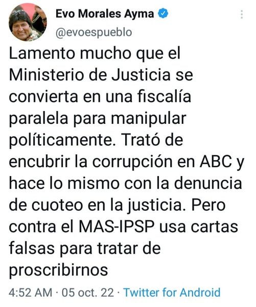 Evo acusa a Lima de encubrir la corrupción en ABC y el cuoteo de cargos judiciales