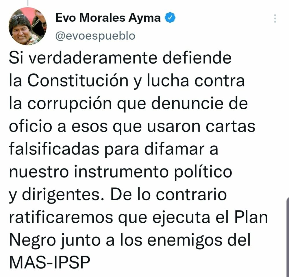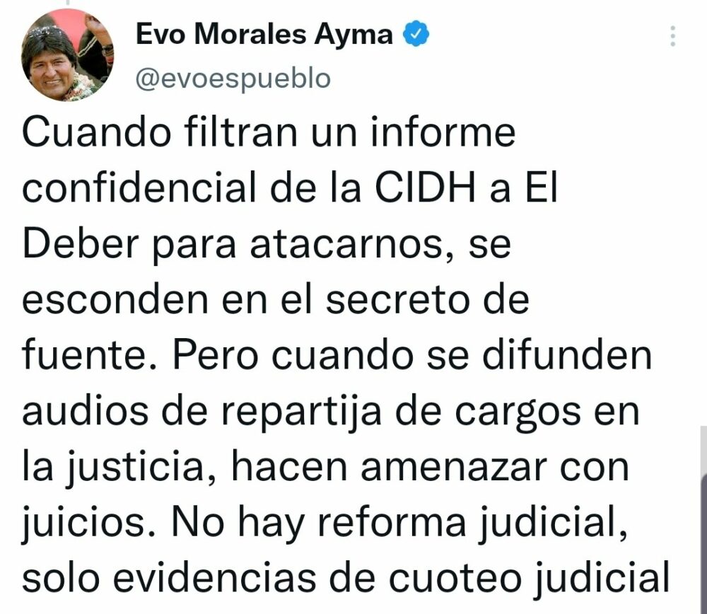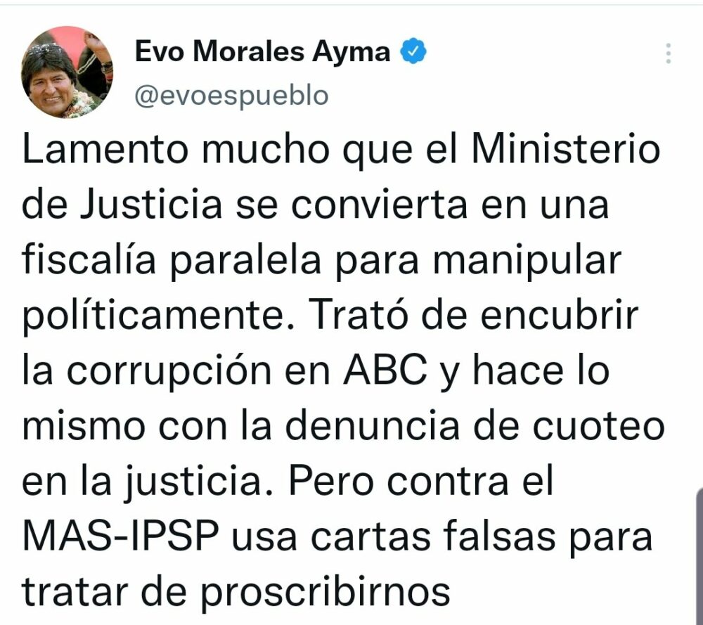 🔵 #ANF | Evo Morales cuestiona al Ministerio de Justicia y lo acusa de tratar de encubrir la corrupción en la ABC, así como la denuncia de cuoteo de cargos contra el Consejo de la Magistratura. «No hay reforma judicial, solo evidencias de cuoteo judicial», tuiteó. https://t.co/nuJ3ZUtrzx