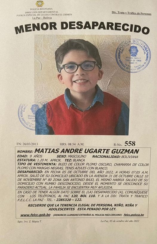 La familia de Matías Andre Ugarte Guzman lo busca desesperadamente, el niño de 9 años desapareció tras salir de su domicilio en la zona San Antonio Bajo.
