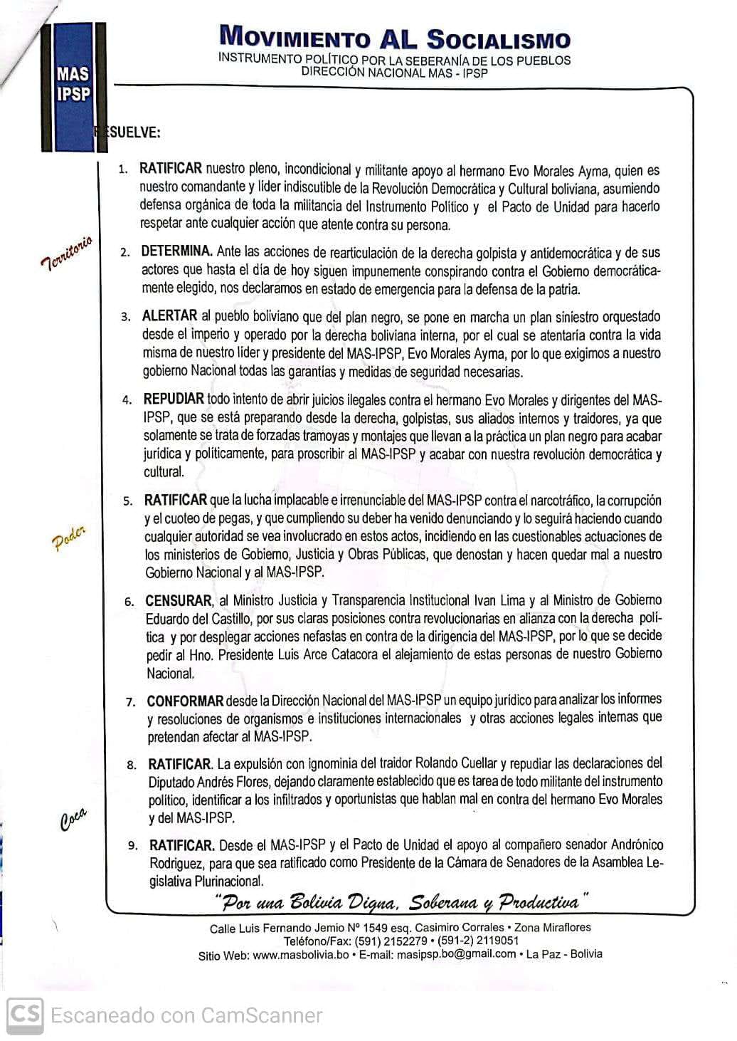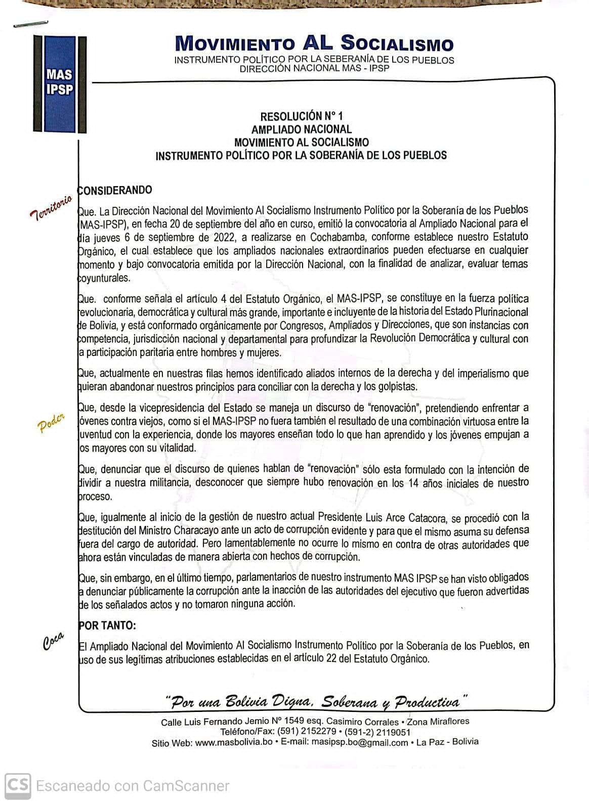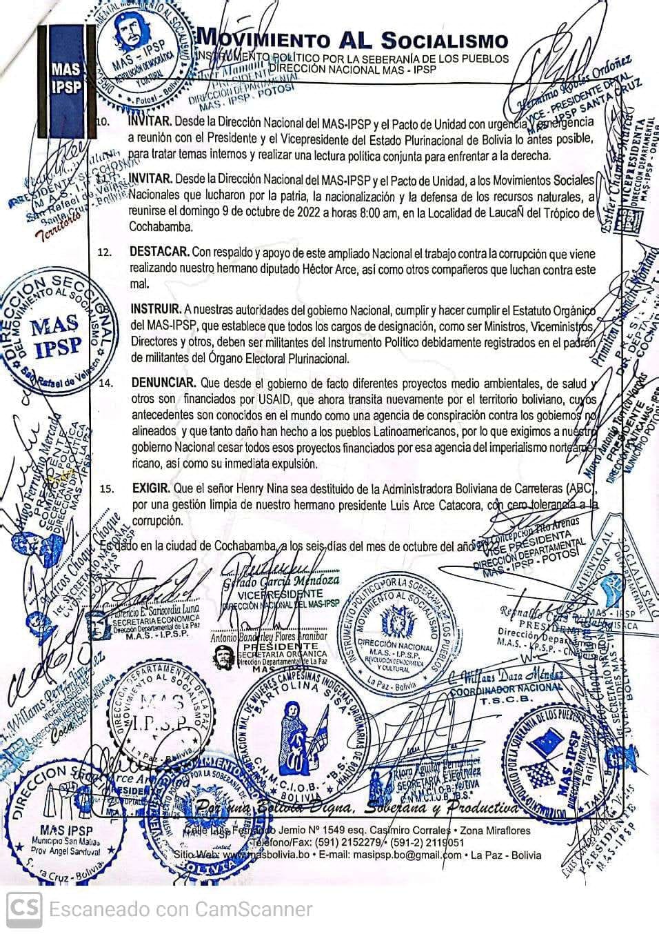 Ampliado del MAS IPS determina pedir al presidente Luis Arce, el alejamiento del gobierno de los ministros de gobierno y de justicia.