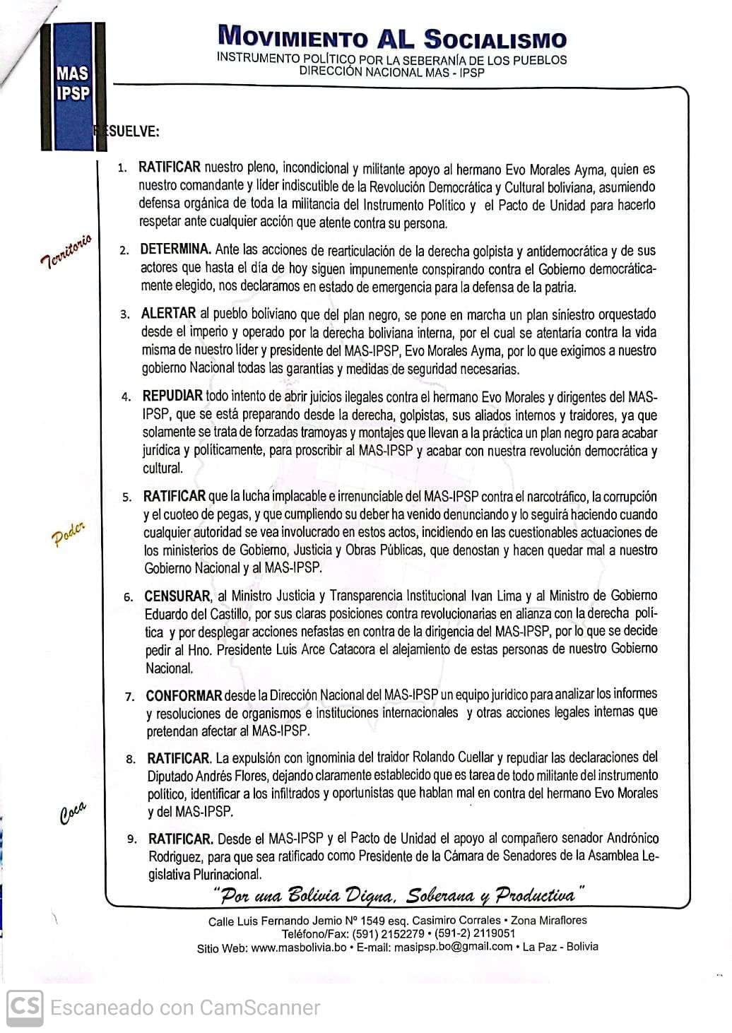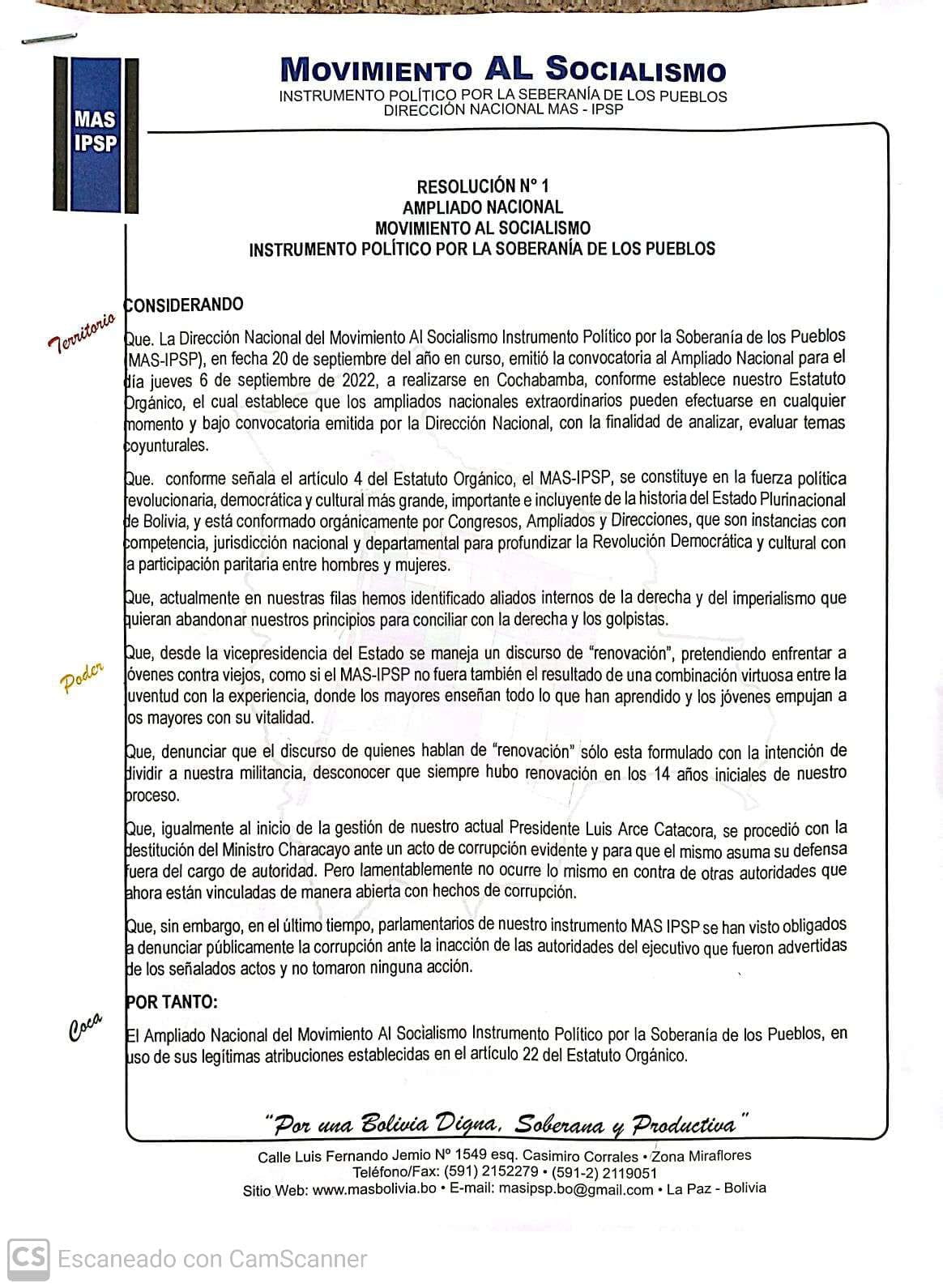 El Ampliado Nacional del MAS, que se realizó este jueves a la cabeza del expresidente, Evo Morales, emitió resoluciones en las cuales pide la destitución de los ministros Iván Lima, Eduardo Del Castillo y del presidente de la Administradora Boliviana de Carreteras (ABC), Henry Nina.