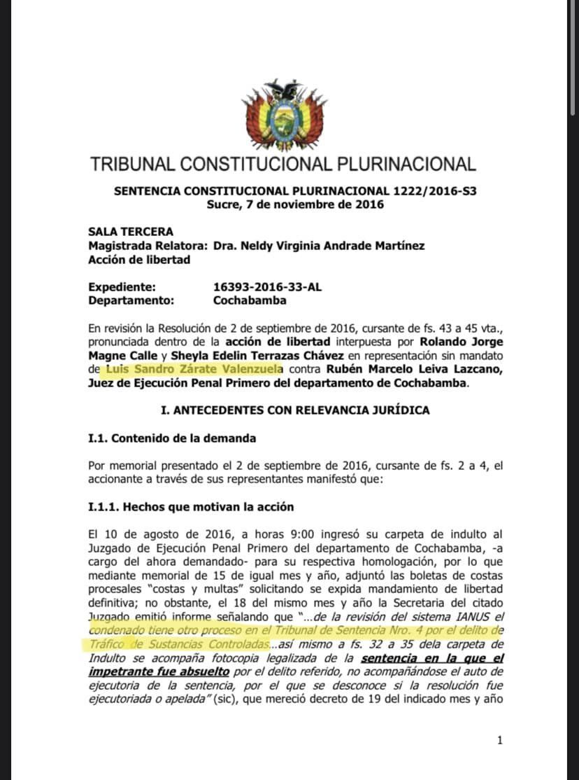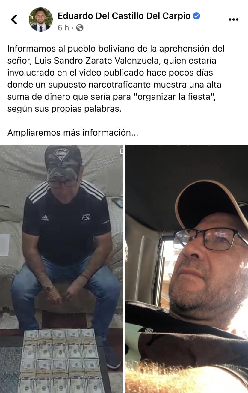 «Se acuerdan del teatro que montó el Ministro de Gobierno (Eduardo Del Castillo) ayer sobre este personaje Luis Sandro Zárate Valenzuela, resulta que el señor ya tiene antecedentes por narcotráfico y trabaja como informante de la FELCN hace muchos años, incluso les podría casi afirmar que trabajaba como informante de Maximiliano Dávila (preso por narcotráfico con orden de extradición a EEUU). En resumen, utilizaron un trabajador de la FELCN para montar esta bellacada queriendo mostrar algo de resultados y además para tapar la cobardía del ministro para evadir su interpelación», indicó el diputado de Comunidad Ciudadana, Jairo Guiteras.
