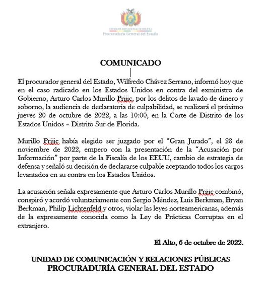 #LoUltimo: Procuraduría General del Estado informa que declaratoria de culpabilidad del exministro Arturo Murillo se llevará a cabo el 20 de octubre