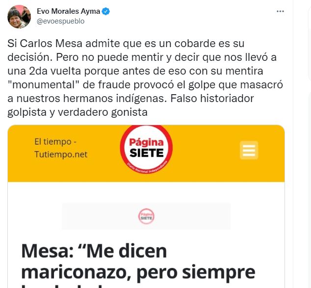 🔵#ANF | #Política El expresidente @evoespueblo respondió a las acusaciones de @carlosdmesag y aseguró que con su mentira del fraude electoral en 2019 se gestó un "golpe de Estado" en el país, hecho que derivó en la masacre de indígenas. pic.twitter.com/9o3MWCNOSC