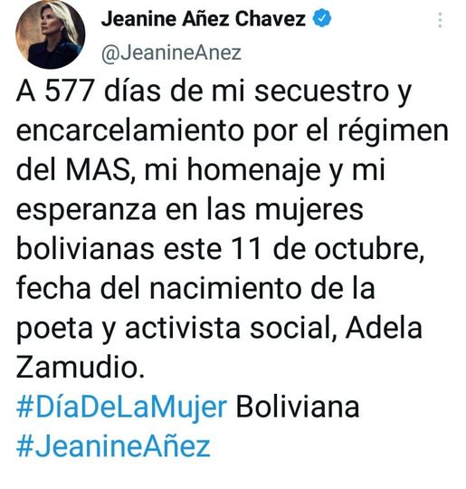 Añez felicita a las mujeres bolivianas en su día y señala que lleva 577 días encarcelada