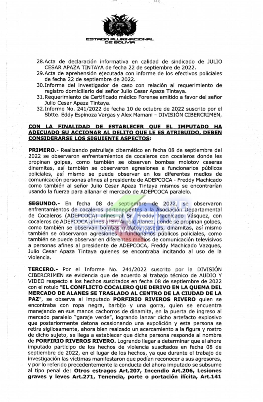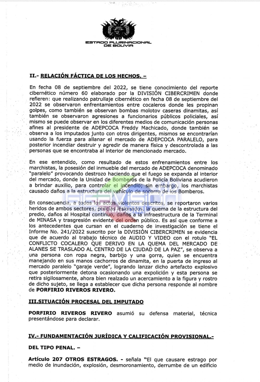 #LaPaz Éste miércoles el Cocalero discapacitado, Porfirio Rivero Rivero, será cautelado por supuestos 12 delitos cometidos durante la toma del mercado paralelo de villa El Carmen el pasado 8 de septiembre del 2022 y según la Imputación fiscal fue identificado como una de las personas que hizo detonar un explosivo en la puerta de ingreso al edificio y piden su detención preventiva por 6 meses en la cárcel de San Pedro, su defensa negó la sindicación fiscal y argumentan que no hay elementos probatorios, en tal razón pedirán su libertad bajo medidas sustitutivas.
