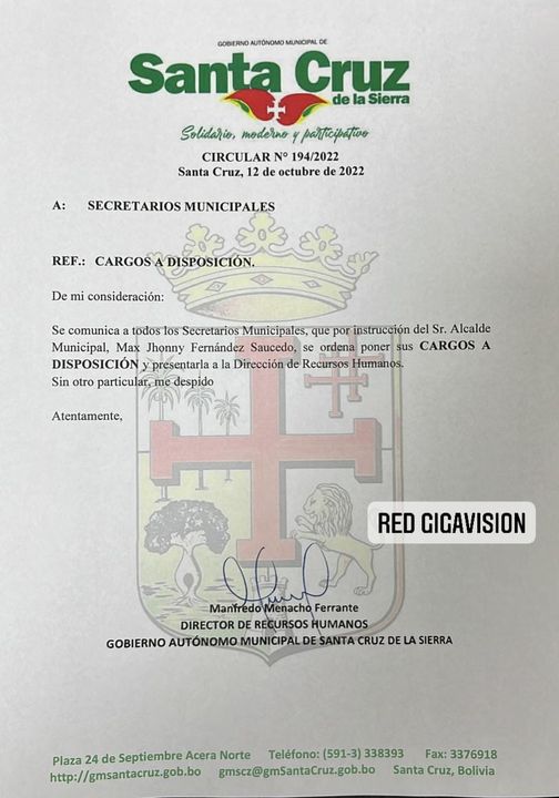 El Alcalde Jhonny Fernández ordena a todos los secretarios municipales, poner sus cargos a disposición.