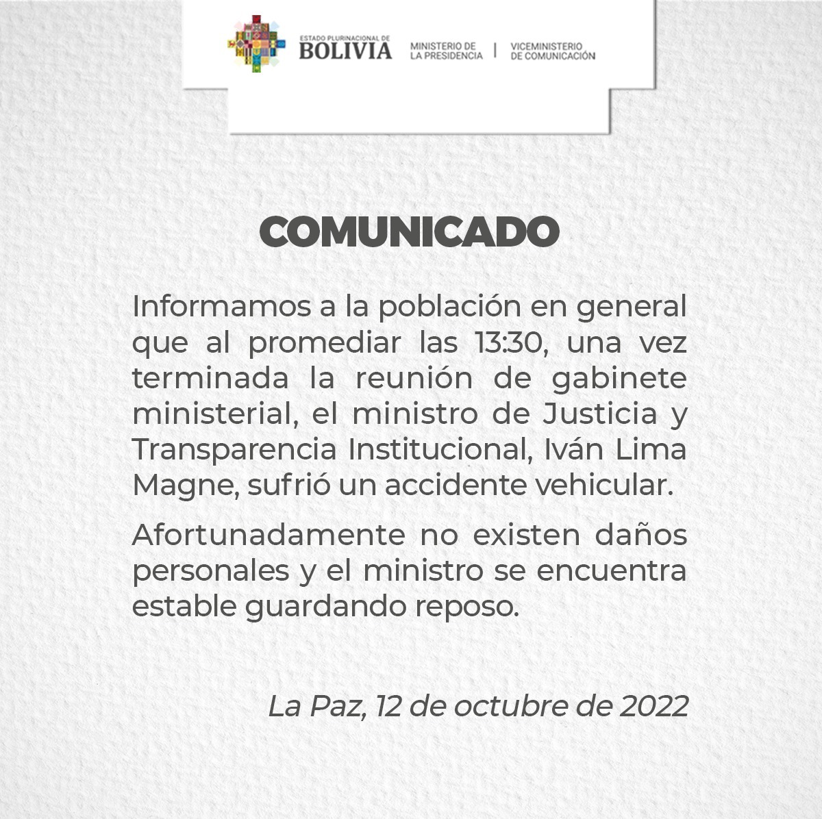 A través de un comunicado el Gobierno informa que el ministro de Justicia, Iván Lima, sufrió un accidente vehicular y que «afortunadamente no existen daños personales y el ministro se encuentra estable guardando reposo».