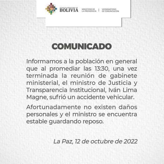 En un comunicado oficial el Gobierno hace conocer que al promediar las 13:30, luego de finalizada una reunión de gabinete ministerial, el ministro de Justicia, Iván Lima, sufrió un accidente vehicular, y que afortunadamente, no hay daños personales, estando la autoridad estable y guardando reposo.