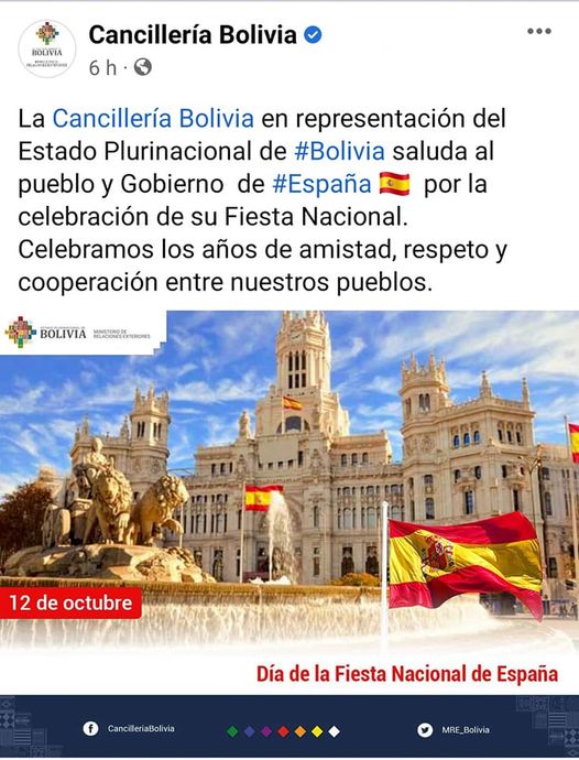 Cancillería de Bolivia mediante redes sociales felicita a España en el día que marca un hito en la historia del genocidio, el saqueo y la explotación en Latinoamérica.