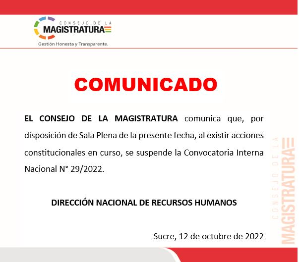 🔵 #Último | #Política El Consejo de la Magistratura comunica que por disposición de Sala Plena, se suspende la convocatoria interna N° 29/2022 para la elección de jueces. pic.twitter.com/GsJTkSr5Sl