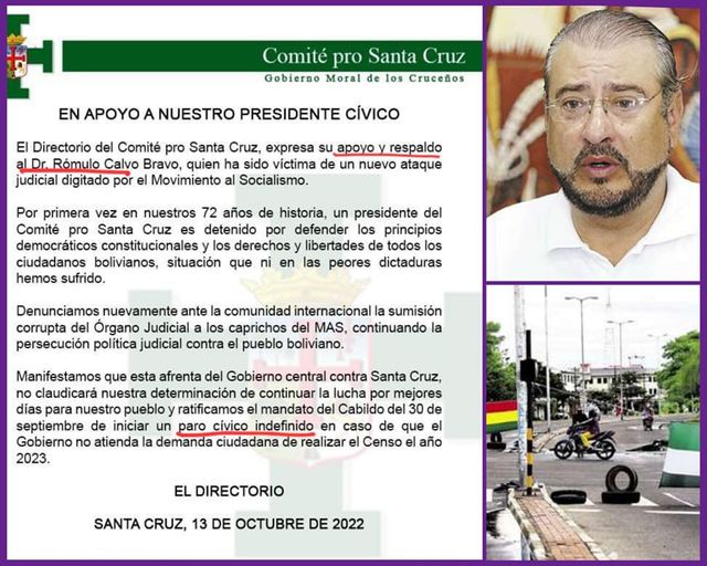 Apoyo a Calvo. Y ratificación del paro indefinido. Pronunciamiento del Comité pro Santa Cruz