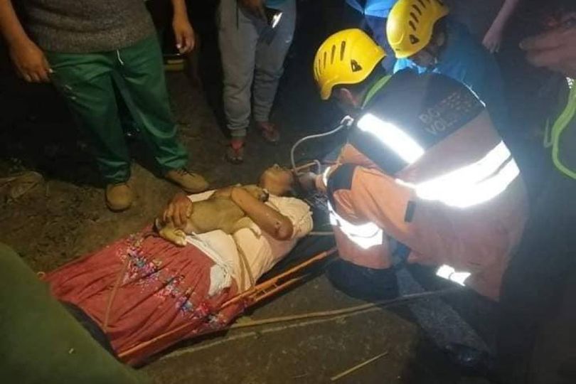 Tras descender 150 metros, los rescatistas encontraron a cuatro personas heridas, una de ellas tenía un perrito entre sus brazos. La mujer no soltó a su cachorro y lo protegió hasta que fueron rescatados.