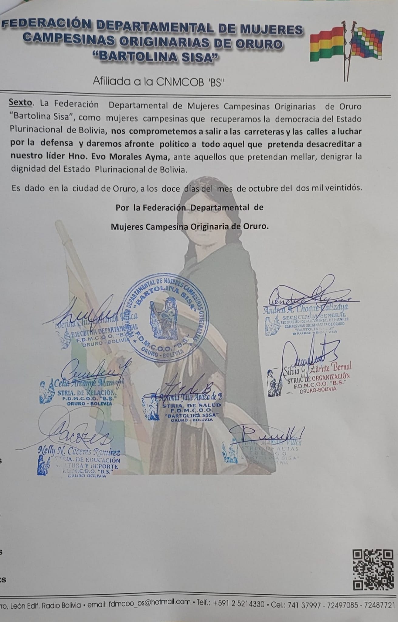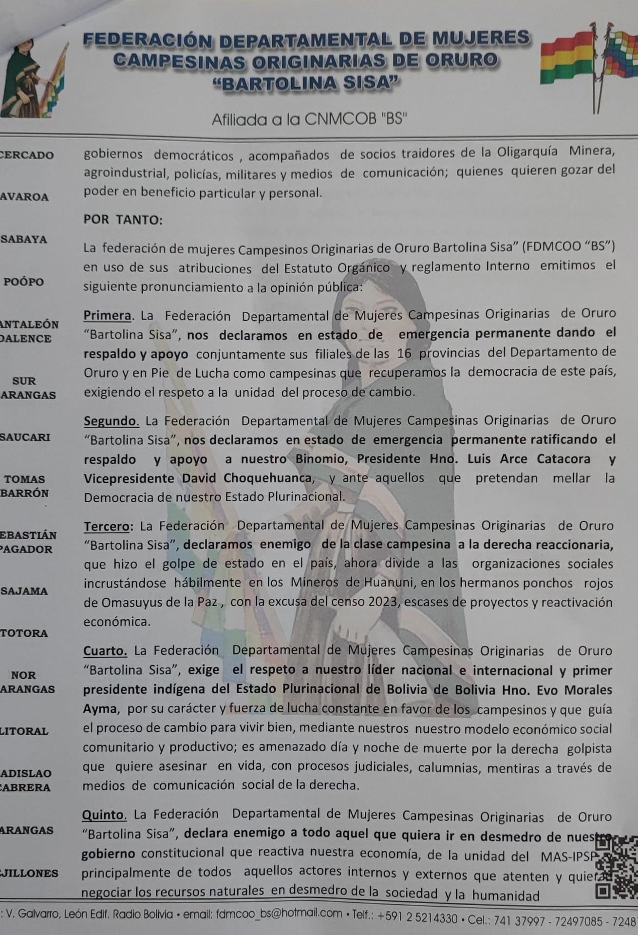 Pronunciamiento de las hermanas de la Federación Departamental de Mujeres Campesinas Originarias de Oruro Bartolina Sisa.