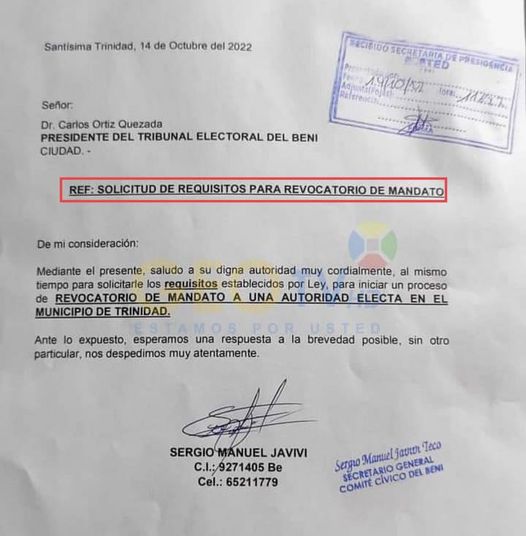 El ciudadano Sergio Manuel Javivi envió una misiva al Tribunal Departamental Electoral del Beni en la que solicita “requisitos para revocatorio de mandato a una autoridad electa en el municipio de Trinidad (Cristian Camara)”.