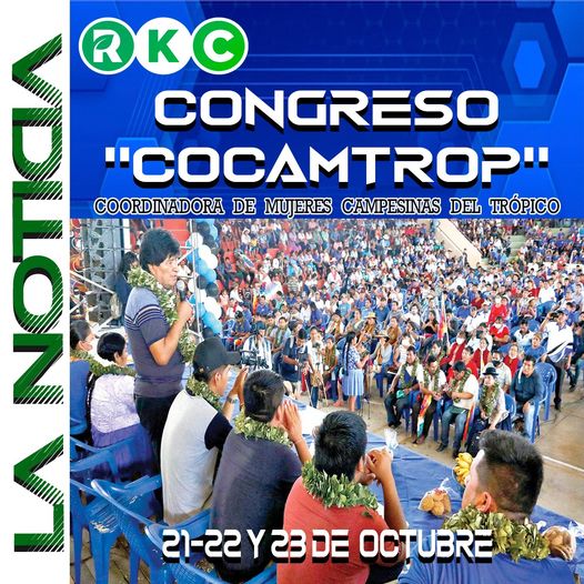 Los días viernes 21, sábado 22 y domingo 23 de octubre, se realizarás el Congreso Ordinario de la Coordinadora de las 6 Federaciones del Trópico de Cochabamba en la sede de la localidad de Lauca Eñe, según confirmaron dirigentes de las federaciones en convocatoria pública.
