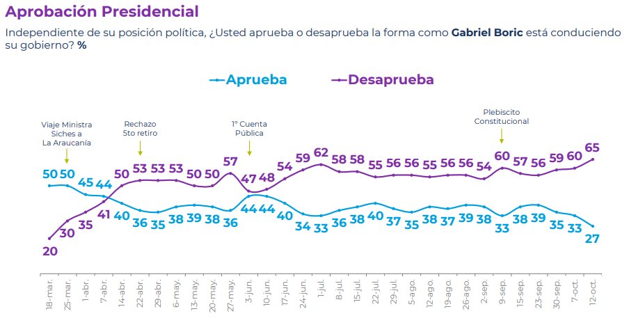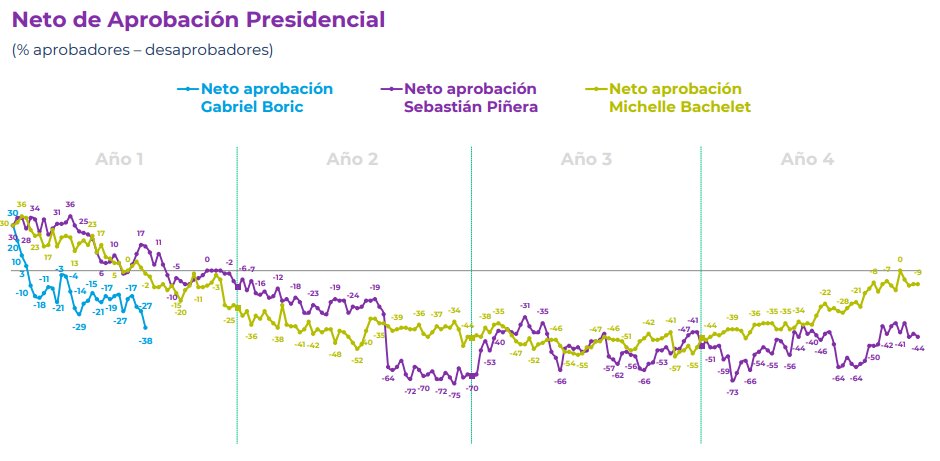 #Chile | La aprobación de Gabriel Boric cae a su nivel más bajo en apenas siete meses de gobiermo. La brecha de aprobación en el mismo período con Bachelet y Piñera (que tampoco lo hicieron ejemplarmente) es creciente. El fracaso y el papelón no pueden ser mayores. https://t.co/IqgsyV6zc7