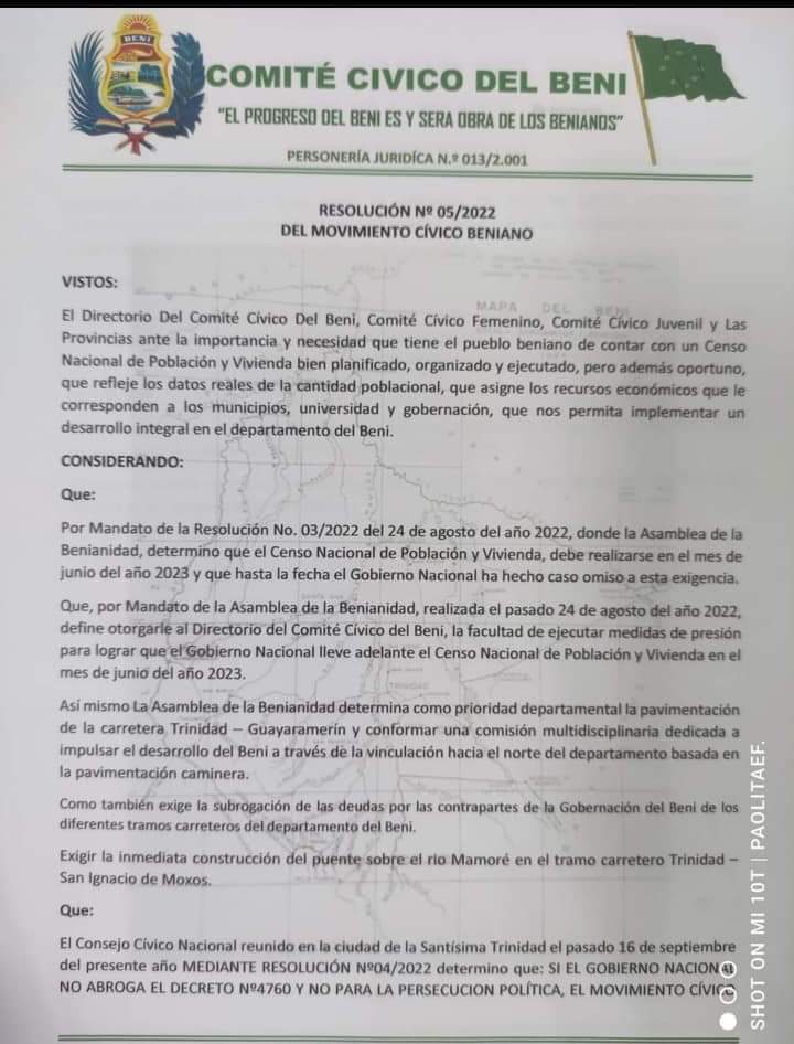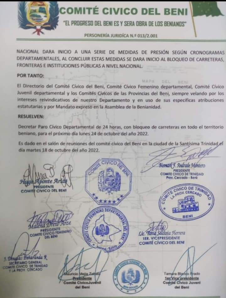 #UltimoMomento: #Beni decreta paro cívico de 24 horas con bloqueo de carreteras para el 24 de octubre