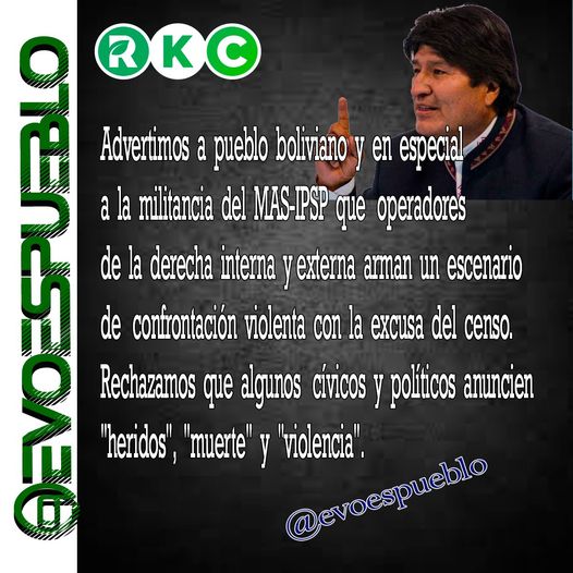 Advertimos al pueblo boliviano y en especial a la militancia del MAS-IPSP que operadores de la derecha interna y externa arman un escenario de confrontación violenta con la excusa del censo. Rechazamos que algunos cívicos y políticos anuncien «heridos», «muerte» y «violencia».