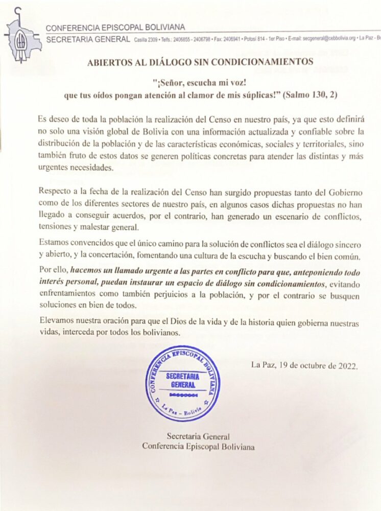 | La Conferencia Episcopal Boliviana (CEB) hace un llamado urgente al diál…