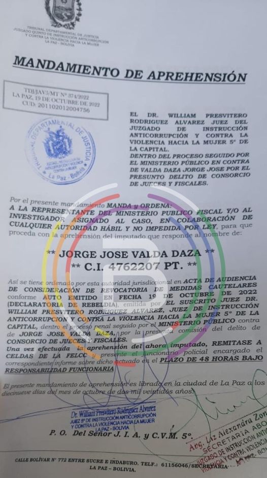 Emiten orden de aprehensión contra Jorge Valda, abogado de la ex senadora Jeanine Áñez, investigado por el delito de consorcio de jueces y fiscales. 📸 BTV