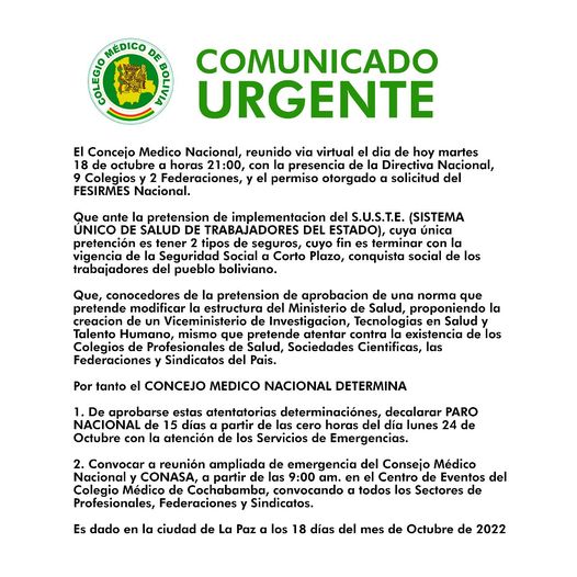#URGENTE: Colegio Médico de Bolivia anuncia paro de 15 días a partir del 24 de octubre
