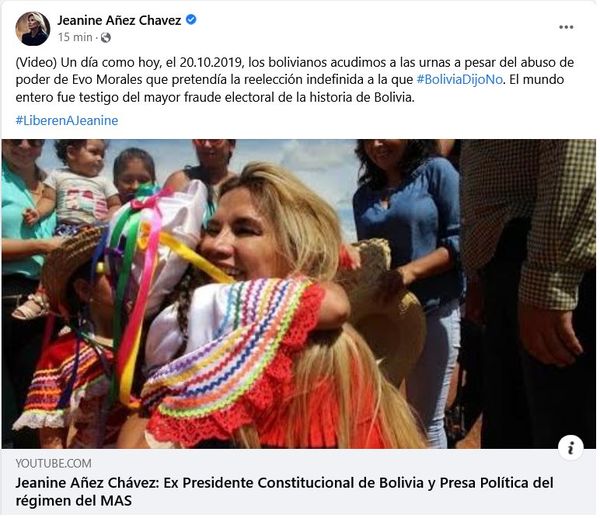 Añez dice que el 2019 «el mundo entero fue testigo del mayor fraude electoral de la historia de Bolivia»