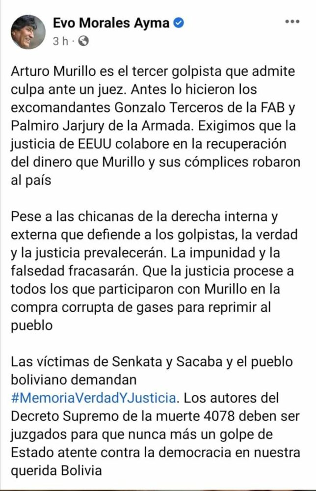 🔵 #ANF | #Política El líder del MAS, Evo Morales, exige a la justicia de EEUU colaborar para que #Bolivia recupere el dinero que el exministro de Gobierno, Arturo Murillo, y sus cómplices habrían robado. https://t.co/chnkALku6n