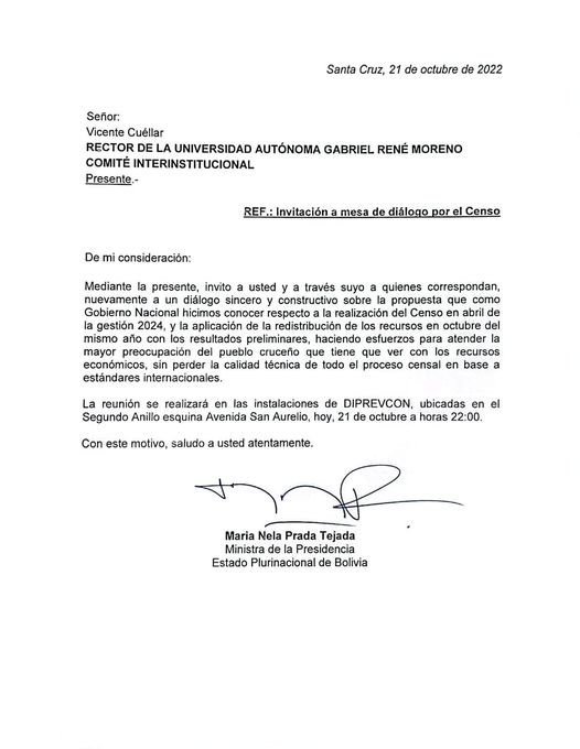 #Gobierno Nacional: Invita a la mesa de diálogo a los miembros de la Comisión Interinstitucional de Santa Cruz para hoy a las 22hrs.