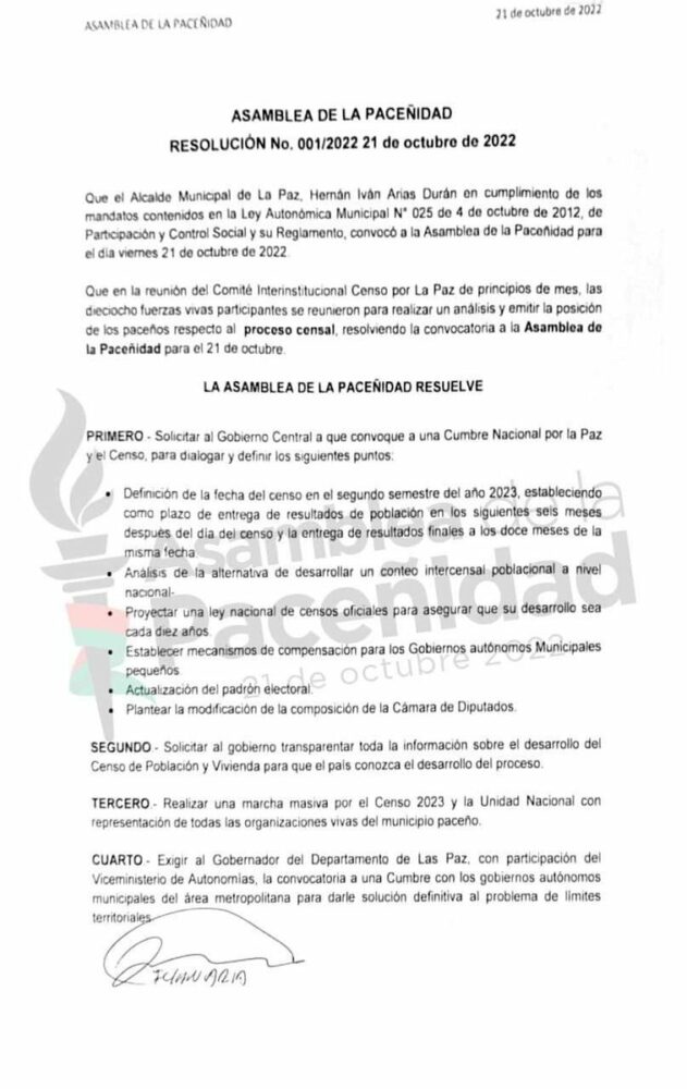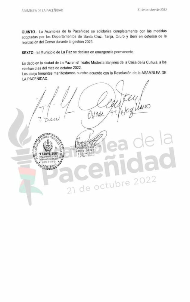 🔵 #Último | #ANF La Asamblea de la Paceñidad resolvió solicitar al Gobierno que convoque a una cumbre nacional para tratar el tema censo. También determinó la realización de una marcha por el censo 2023.