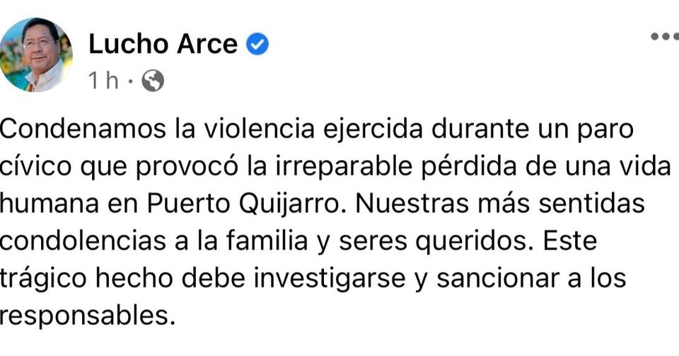 El Presidente Luis Arce lamenta el fallecimiento de una persona en los enfrentamientos en …