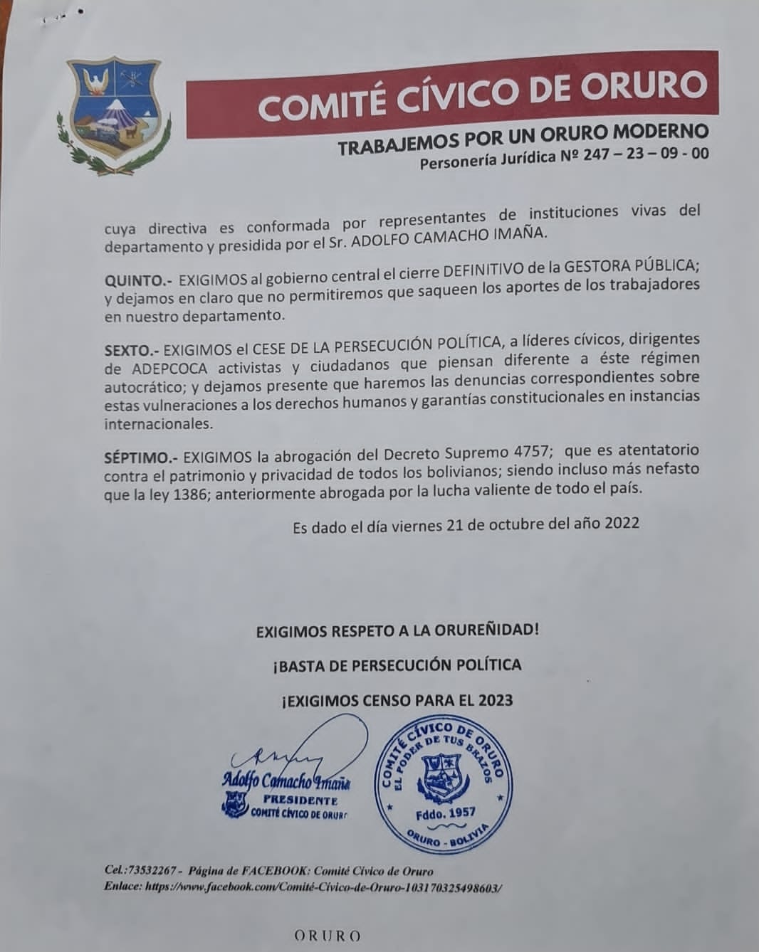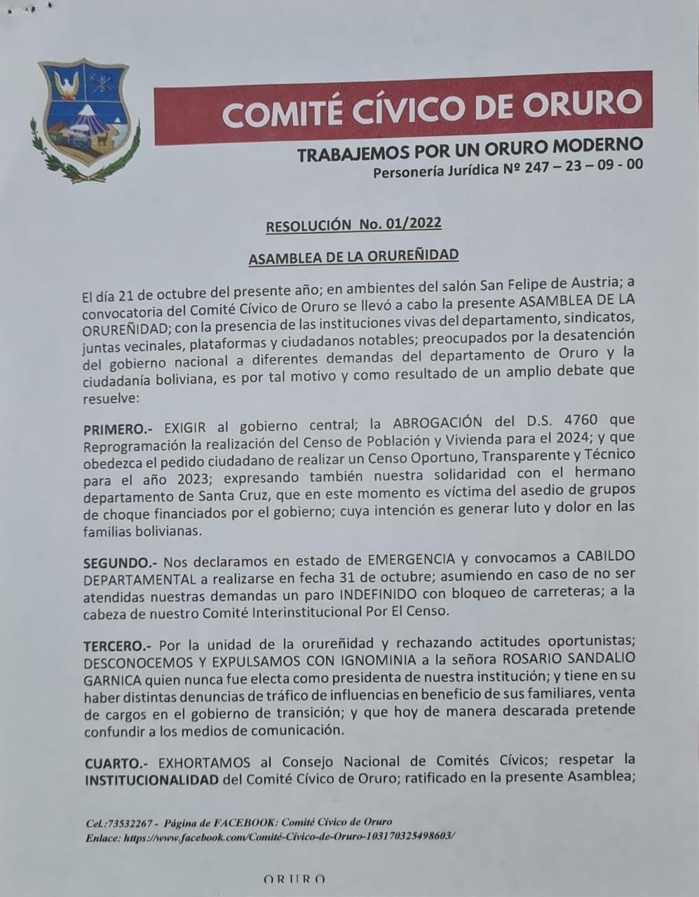 #Oruro se declara en ESTADO DE EMERGENCIA y convoca a Cabildo para el 31 de octubre