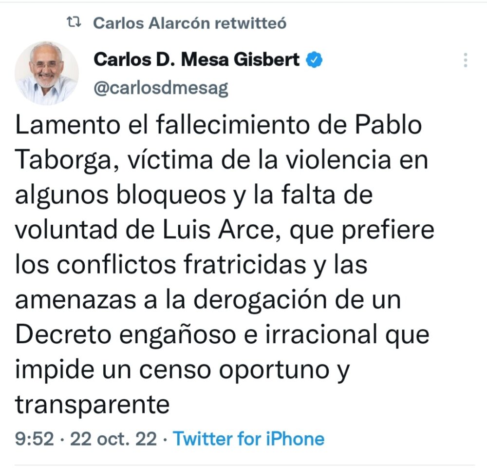 🔵#ANF |#Política El expresidente @carlosdmesag lamentó el deceso de Julio Pablo Taborga en el municipio de Puerto Quijarro, cuestionó la falta de voluntad por parte del Gobierno para no solucionar el conflicto. https://t.co/vG1AJRUOmt