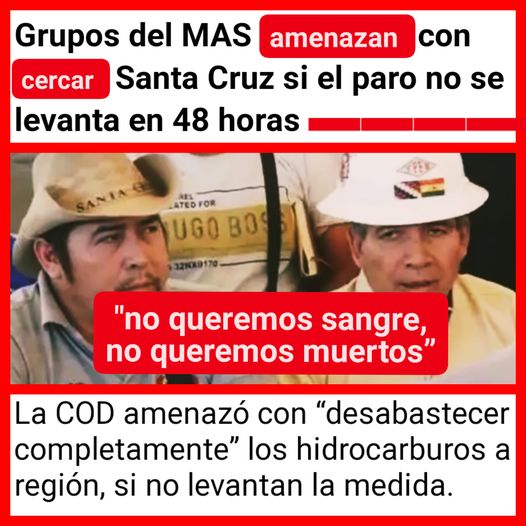 “Hemos tomado la determinación de que en caso que no levanten su medida de presión en 48 horas, nosotros vamos a cercar Santa Cruz, con todas las regionales de nuestras 15 provincias, ya que han perjudicado a la gente más humilde”