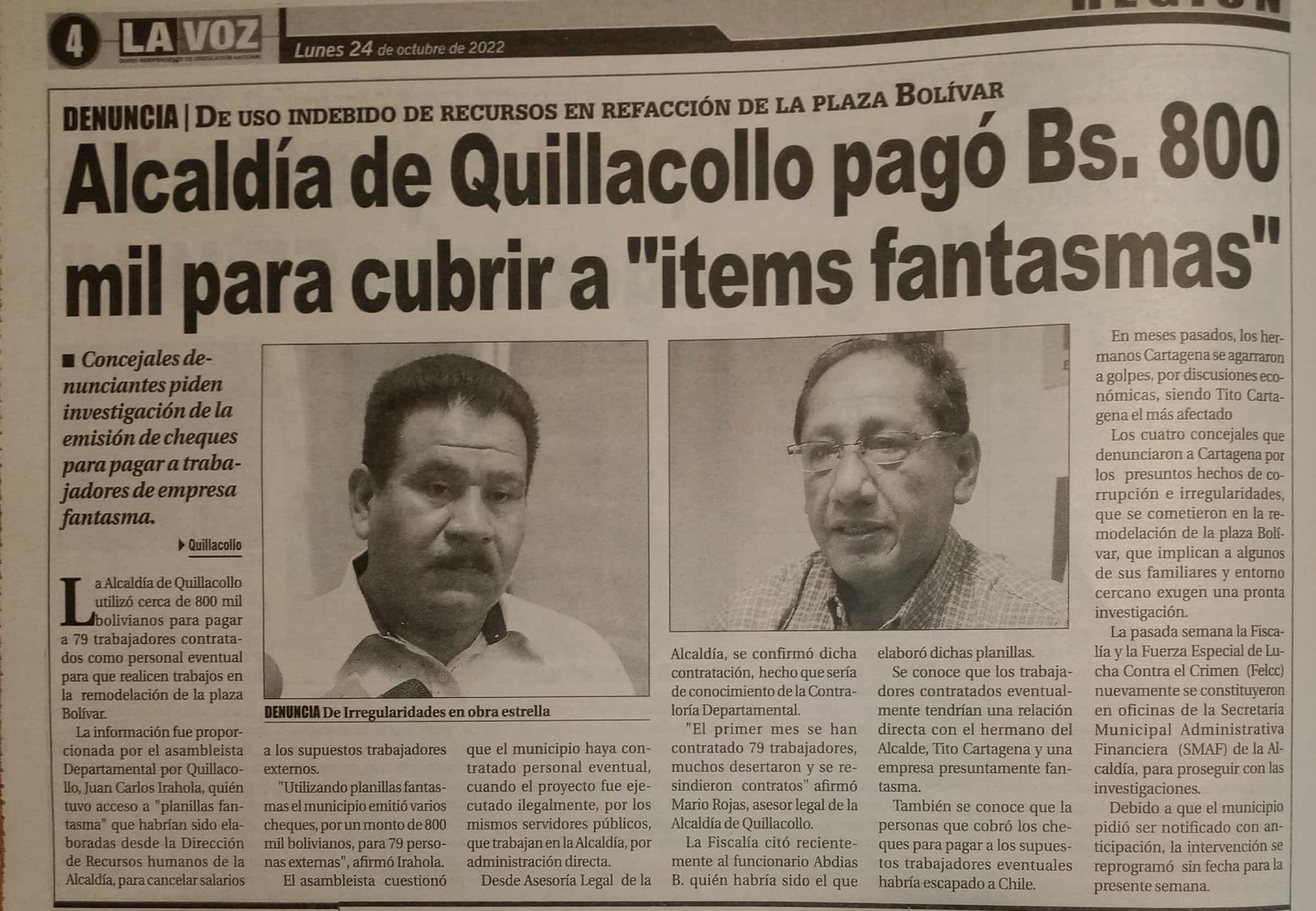 El Municipio de Quillacollo contrató personal eventual cuando el proyecto fue ejecutado, por los mismos servidores públicos que trabajan en la alcaldía de Quillacollo»