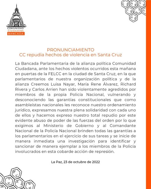 Pronunciamiento de #ComunidadCiudadana contra los hechos de violencia en #SantaCruz
