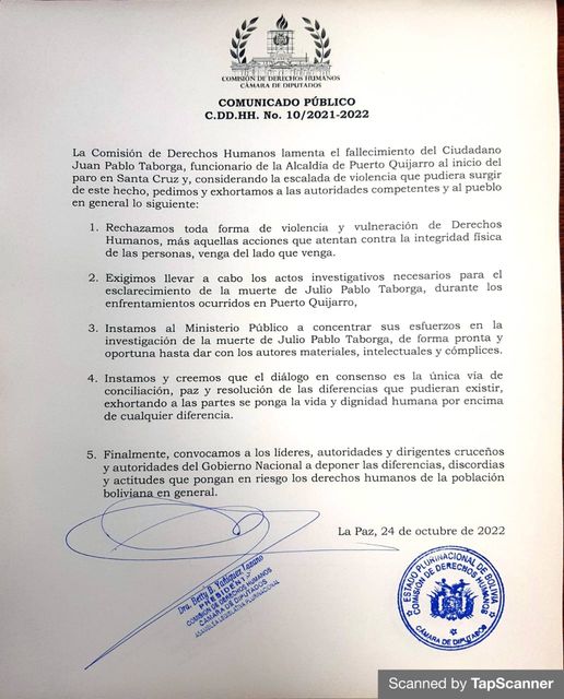 Comisión de Diputados rechaza violencia y vulneración de derechos en puntos de bloqueo en #SantaCruz