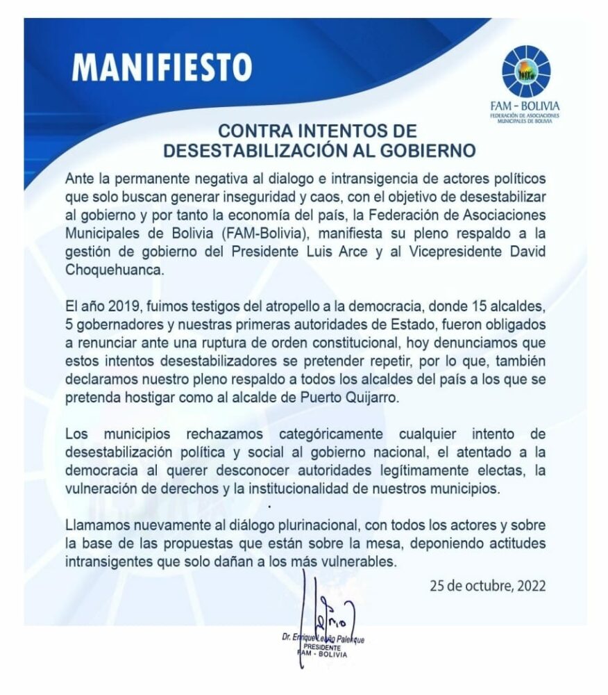 Nuestros municipios del país rechazan de forma categórica cualquier intento de desestabilización económica y social, con paros y movilizaciones injustificadas que solo afectan a las familias más humildes. Gracias por su apoyo @FAMBolivia, seguiremos trabajando por la Patria. https://t.co/2jdqtucWnS