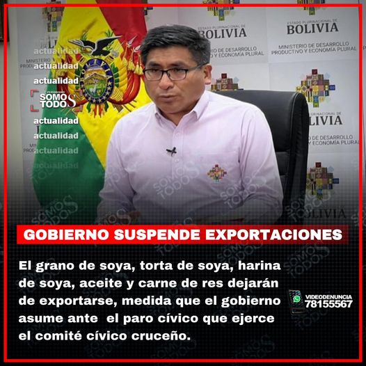 Bolivia suspenderá desde las 00:00 de este jueves las exportaciones de grano de soya, torta de soya, harina de soya, aceite y carne de res.