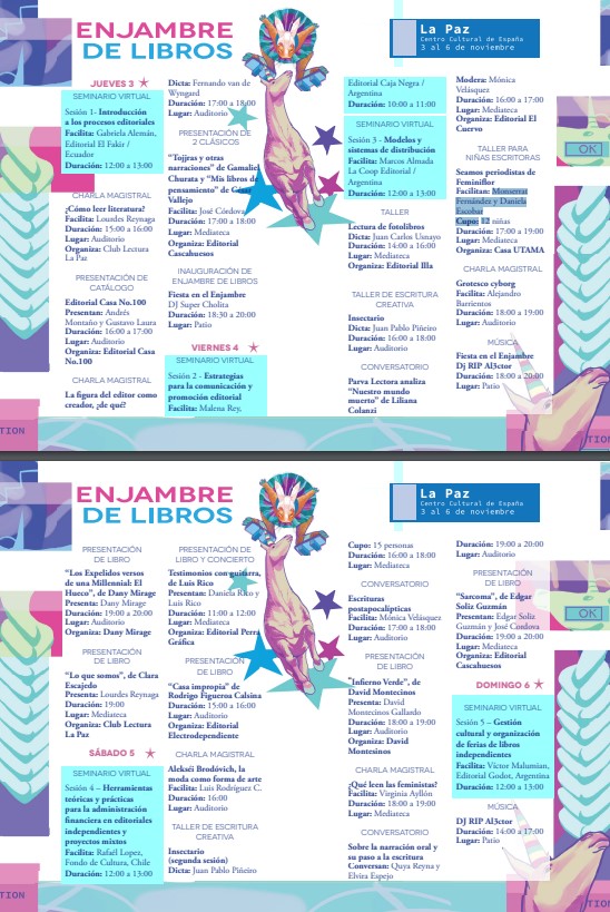 Enjambre de Libros, un esfuerzo colectivo que nació de la alianza de editoriales y librerías bolivianas, informó que los talleres presenciales a cargo del novelista se dictarán el viernes 4 y el sábado 5 de noviembre, de 16:00 a 18:00, en el Centro Cultural de España en La Paz (CCELP), ubicado en la avenida Camacho de la sede de gobierno. El ingreso será gratuito.