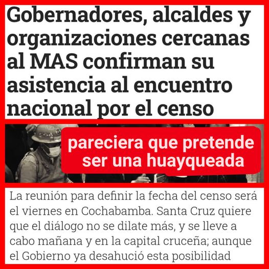 El politólogo Carlos Cordero 🗣️ manifestó que pueden darse tres escenarios en la reunión. Primero, que el Gobierno mantenga su postura para la realización del censo en 2024. Segundo, que se dé entre las autoridades un acuerdo intermedio para la realización del operativo censal. Tercero, que el Gobierno acepte que el operativo censal sea realizado en 2023, como pide Santa Cruz.