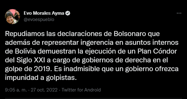 🔵 #ANF | Evo Morales expresa su repudio tras las declaraciones de Jair Bolsonaro sobre los refugiados políticos. El exmandatario considera que se trata de una «injerencia» en asuntos internos de #Bolivia. «Es inadmisible que un gobierno ofrezca impunidad a golpistas», tuiteó. https://t.co/MUx0mpNsGq