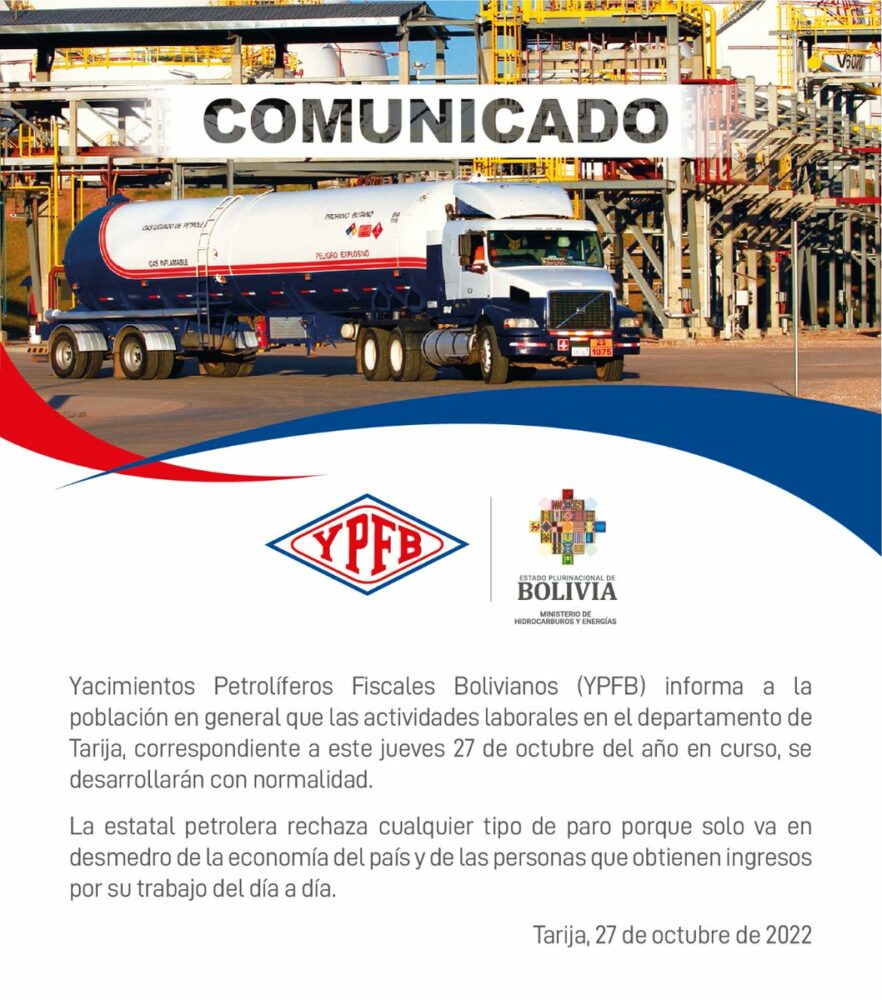 🔵 #ANF | @YPFB_corp informa que las actividades laborales en el departamento de #Tarija se desarrollan con normalidad este jueves 27 de octubre, pese al paro en demanda del #censo en 2023. https://t.co/7So9fQs4yh